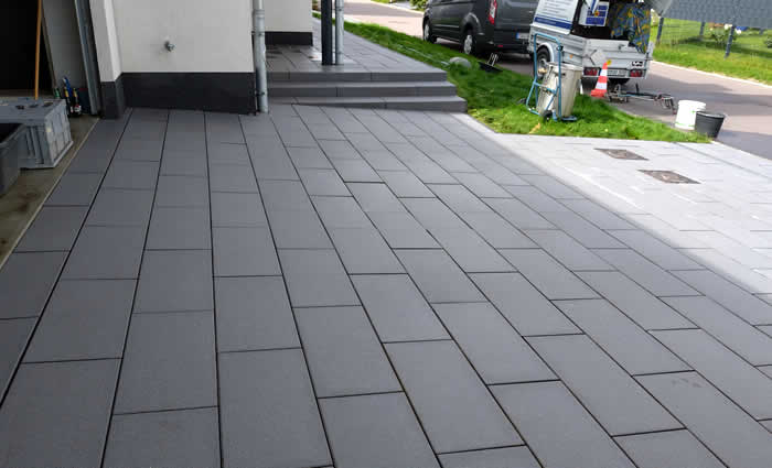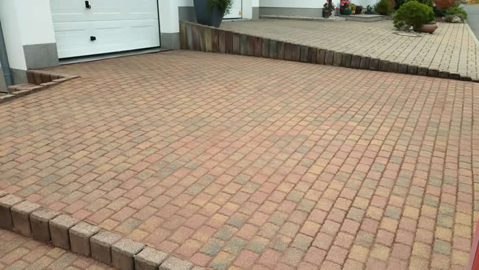 Pflasterreinigung einer Grundstückszufahrt, Terrasse und aller Zuwege. Verfugen mit besonders schönem Edelbrechsand in der Farbe Terracotta-Rot.